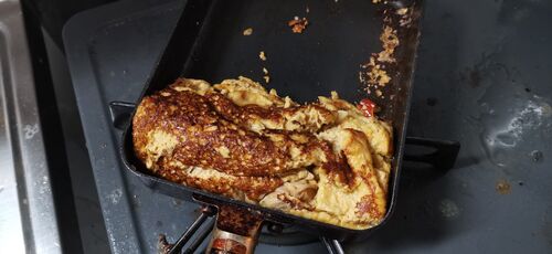 昨日のカレーの残りに、出汁を加えて伸ばします。おそばを茹でます。ピーマンの卵焼きを作りましょう。出来ました。これが今日の夕食です。おわり